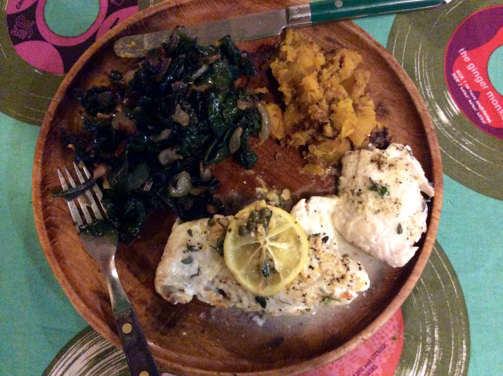 Baked Halibut in a lemon/mustard/caper sauce combined with kale sautéed with bacon and onion and sautéed pre-baked sugar pie pumpkin makes a scrumptious low carb meal.