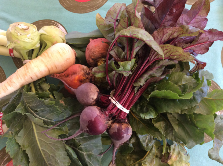 So good, pretty and easy! Take a mix of colored raw winter vegetables; your choice; (I’m sharing our latest mix- but almost any root veggies that you like will be fine for this).