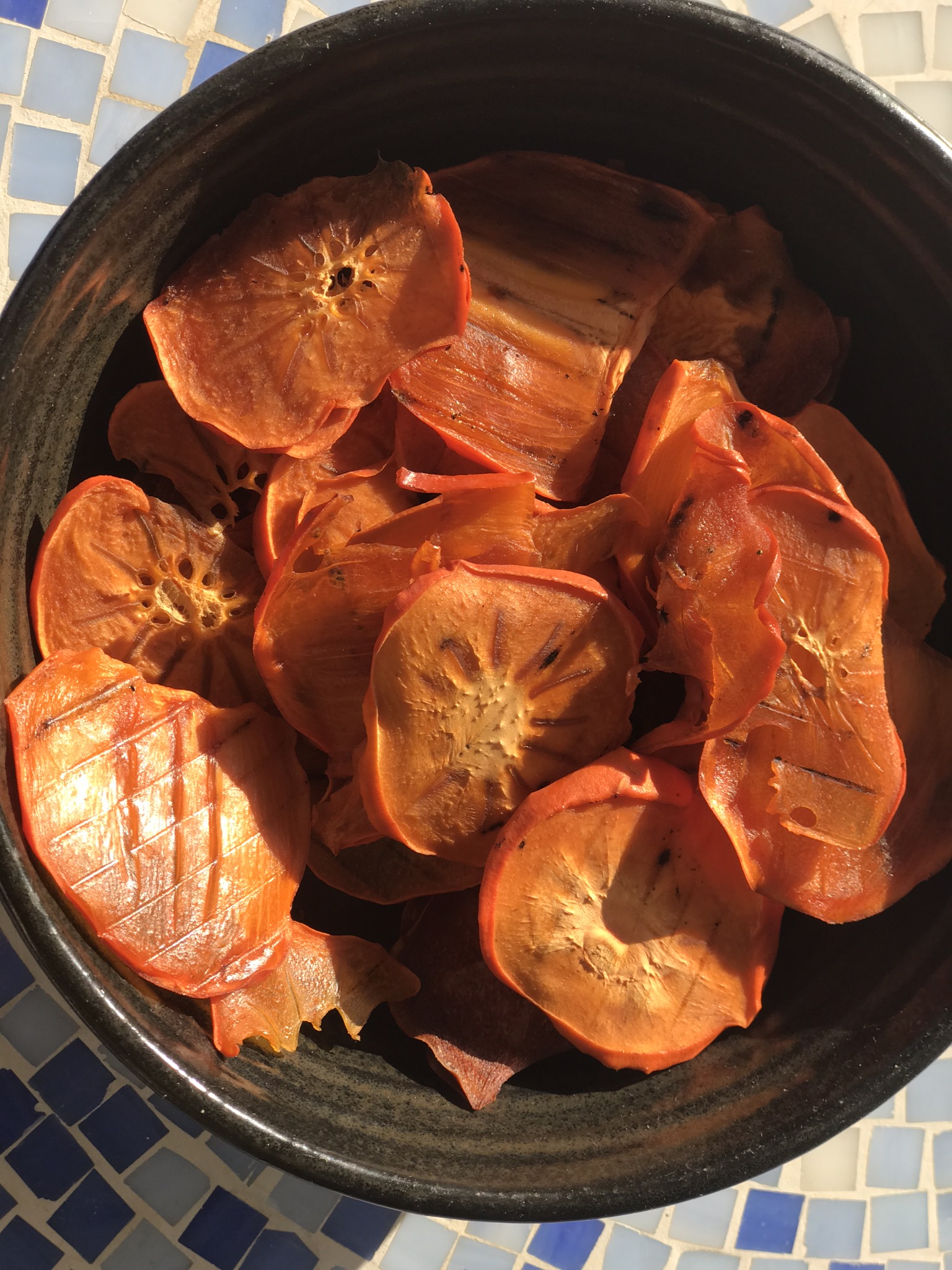 It’s definitely fall here in Santa Cruz- although it’s the start of winter in much of the country. Here we don’t get the glorious fall colors of my native Ohio, but we do get gloriously colored fall produce, like the Persimmons. You probably know there are at least two common varieties of this fruit—Fuyu, which can be eaten right away, and Hiyachi, which need to be completely ripe and mushy before eating or cooking in most ways (otherwise they are very astringent, due to their tannin content). However, there’s a great way to use either of these persimmon varieties, especially when not quite ripe- dried persimmons!  That’s the beauty of drying persimmons—it’s actually better when they’re firm. And the astringency somehow goes away.